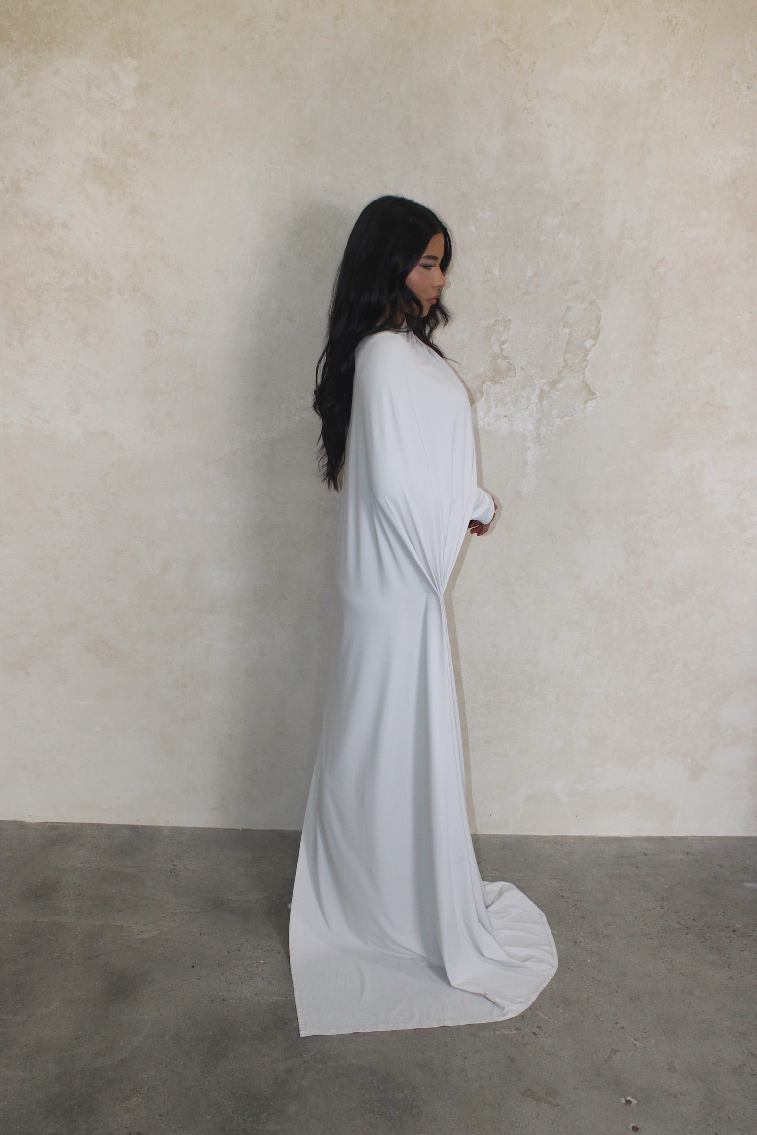 Crafted with thoughtful design details, this dress features a beautifully gathered waist that creates a flattering silhouette while maintaining comfortable coverage. The flowing fabric drapes gracefully from shoulder to floor, creating an unbroken line of sophistication that moves beautifully with every step.