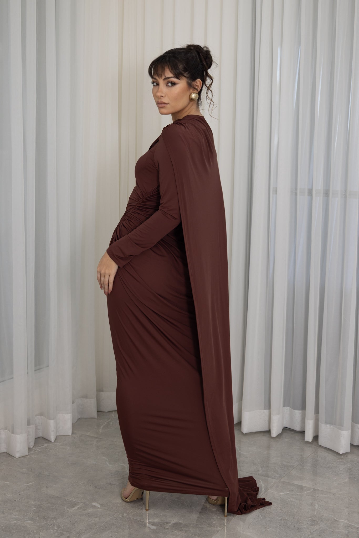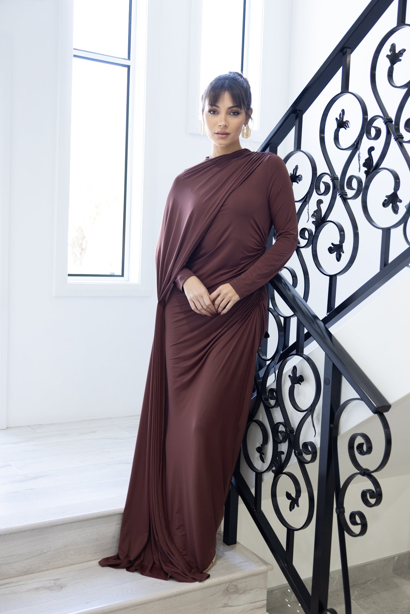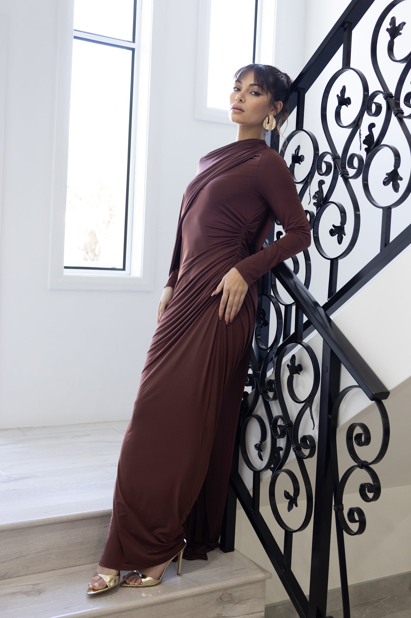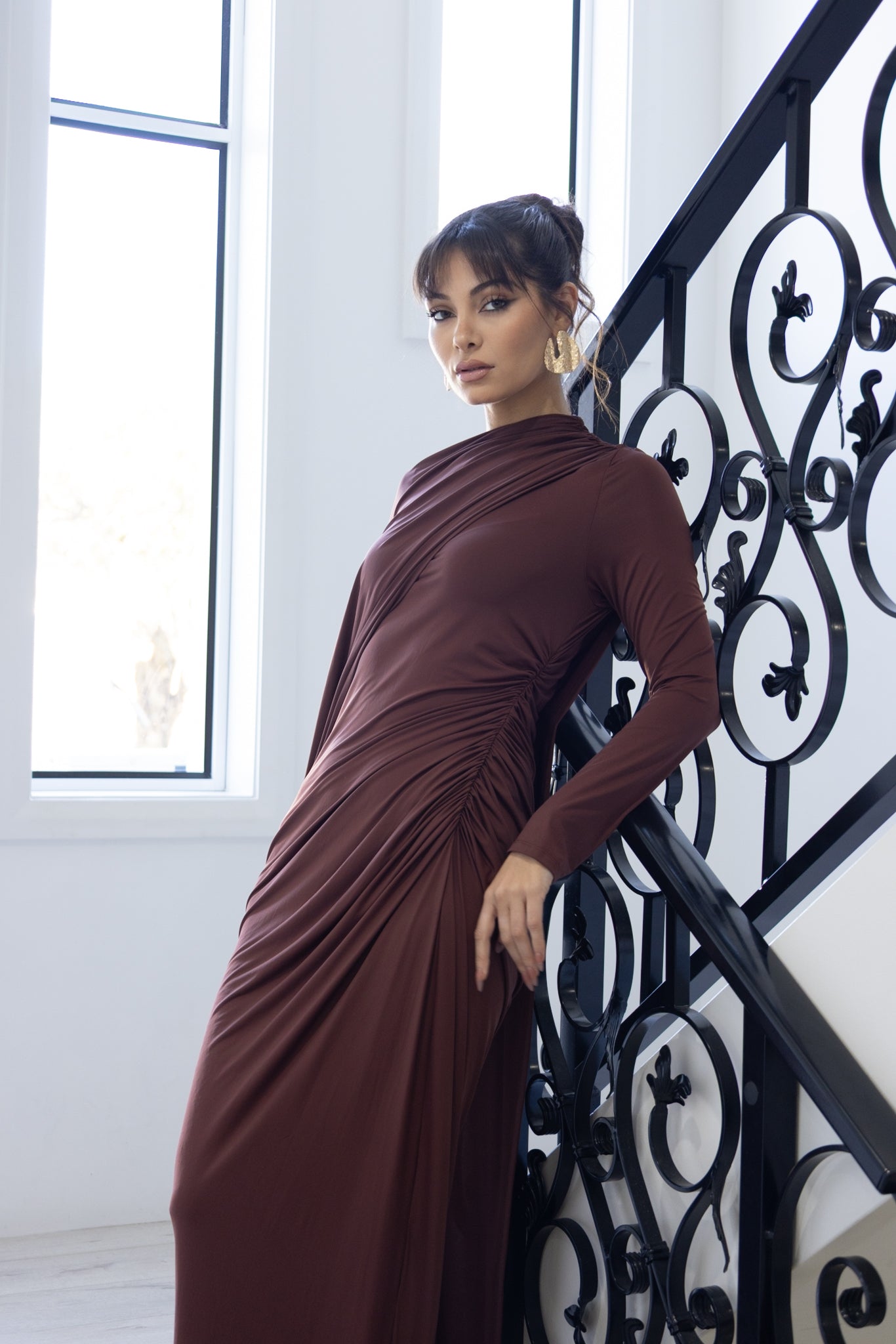 This elegant mocha dress is perfect for any special occasion, with its modest design and classy silhouette. Made from stretchy draping fabric, it exudes sophistication and timeless style. Perfect for any event, this dress is a must have for any fashion forward individual.