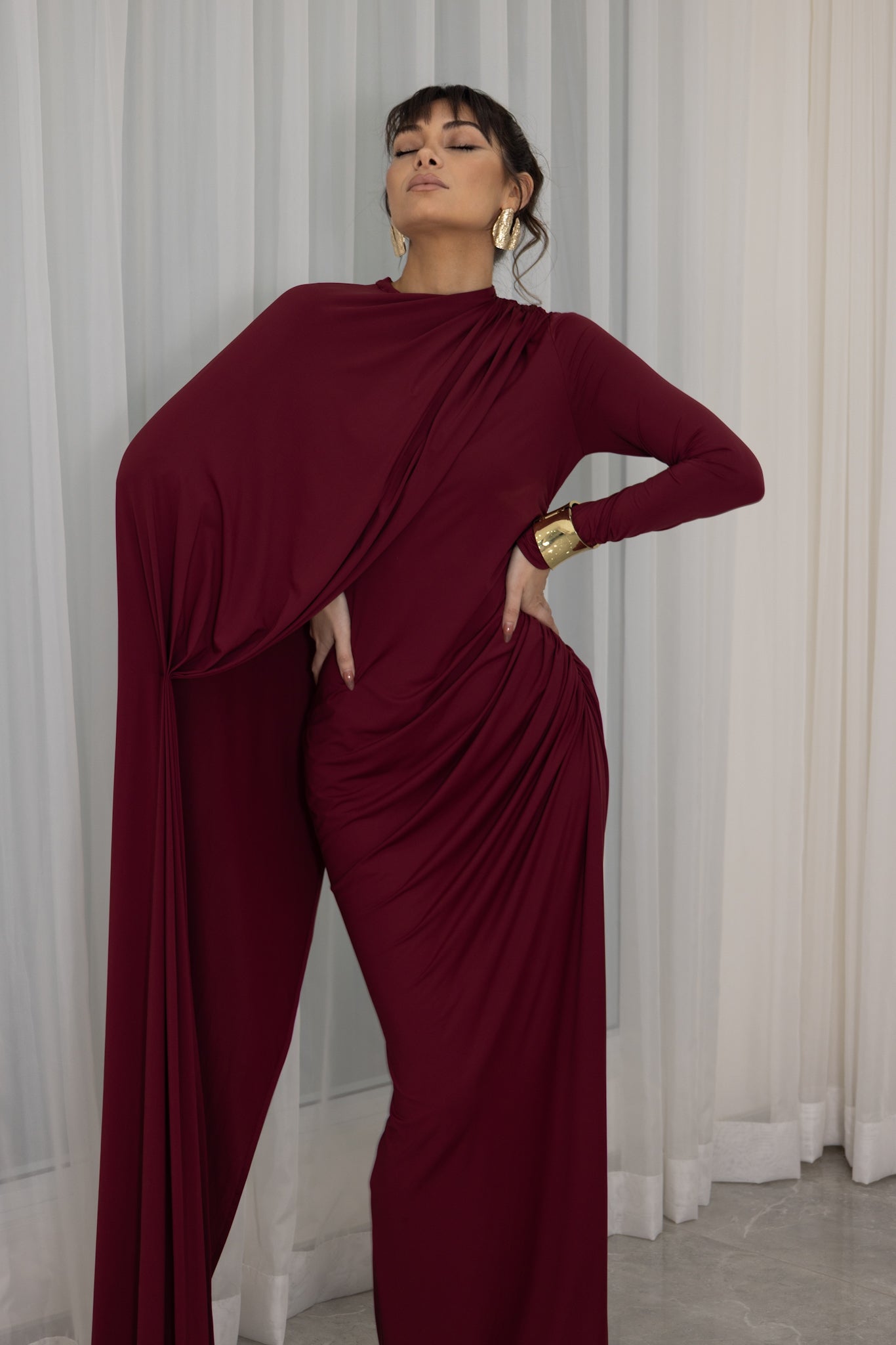 Regalia, a floor length burgundy dress with a high neckline and long sleeves. Designed with a soft, asymmetric drape from the shoulder and subtle gathering at the waist. Elegant, modest, and effortlessly refined.